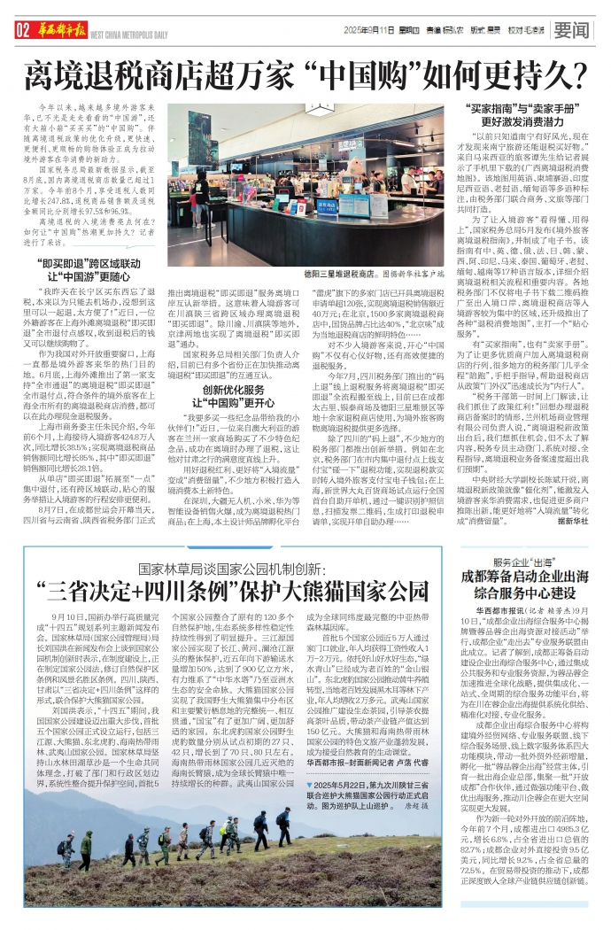 今年7月,四川税务部门推出的“码上退”线上退税服务将离境退税“即买即退”全流程搬至线上,目前已在成都太古里、银泰商场及德阳三星堆景区等地十余家退税商店使用,为境外旅客购物离境退税提供更多选择。