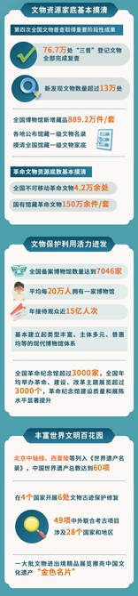 当前,我国完成全国石窟寺及摩崖造像、古代名碑名刻文物、革命文物资源等调查公布。各级财政文物保护专项经费持续投入,近2000项全国重点文物保护修缮工程有力推进,1200余项馆藏文物预防性保护项目有效实施,37个革命文物保护利用片区集中连片保护。
