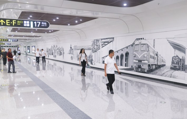 9月17日,在成都地铁17号线二期二仙桥站,市民从站台内文化墙前经过。 新华社发