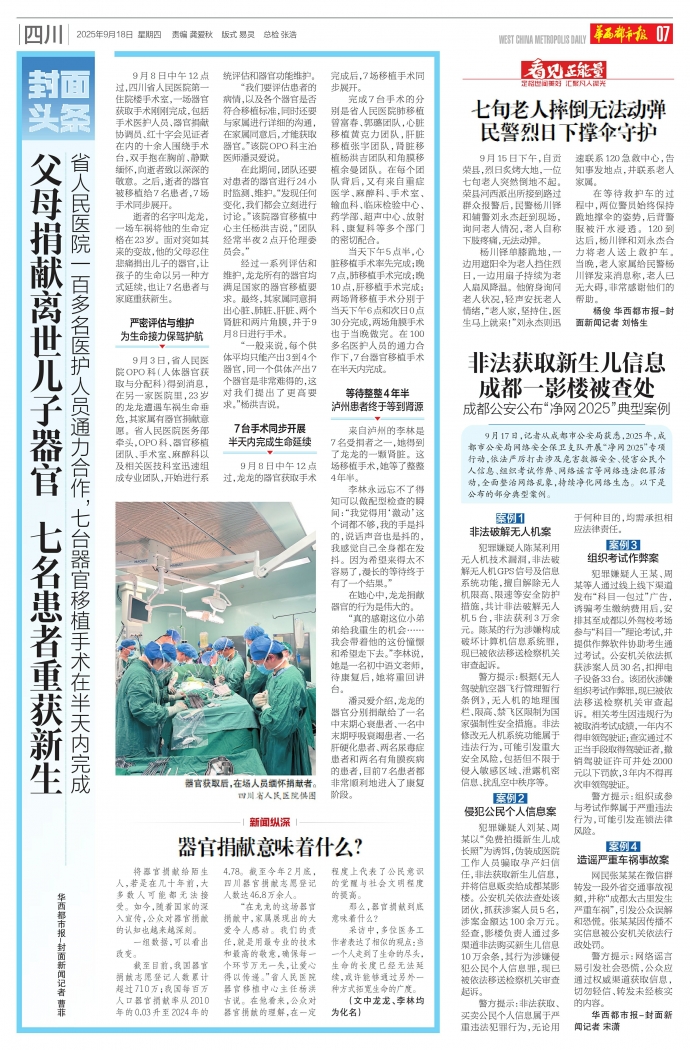 9月8日中午12点过,四川省人民医院第一住院楼手术室,一场器官获取手术刚刚完成,包括手术医护人员、器官捐献协调员、红十字会见证者在内的十余人围绕手术台,双手抱在胸前、静默缅怀,向逝者致以深深的敬意。之后,逝者的器官被移植给7名患者,7场手术同步展开。