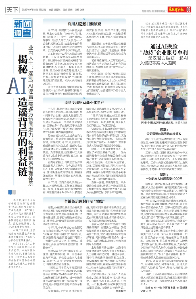 中国社会科学院大学互联网法治研究中心执行主任刘晓春说,新媒体平台应加强对AI造谣和“水军”行为的智能识别机制研究,进一步改革涉及AI内容的流量分发和收益分成机制,最大限度压缩通过AI造谣牟利的空间。