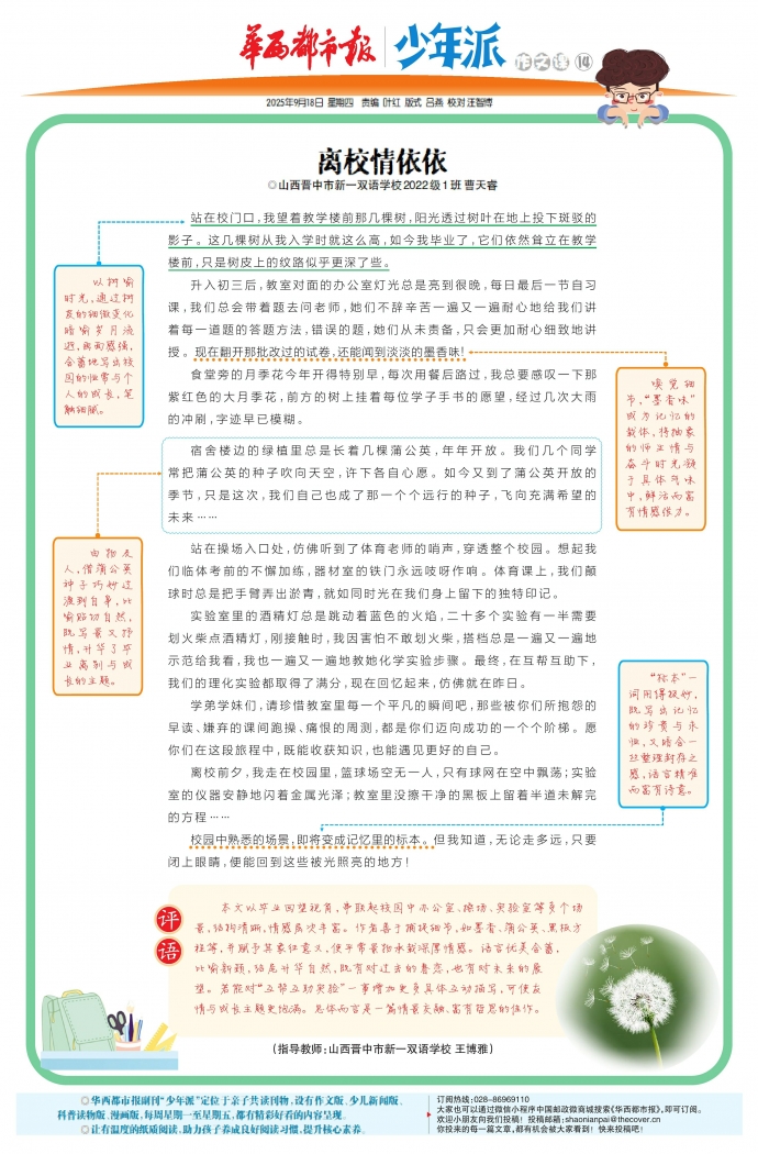 本文以毕业回望视角,串联起校园中办公室、操场、实验室等多个场景,结构清晰,情感层次丰富。作者善于捕捉细节,如墨香、蒲公英、黑板方程等,并赋予其象征意义,使平常景物承载深厚情感。语言优美含蓄,比喻新颖,结尾升华自然,既有对过去的眷恋,也有对未来的展望。若能对“互帮互助实验”一事增加更多具体互动描写,可使友情与成长主题更饱满。总体而言是一篇情景交融、富有哲思的佳作。