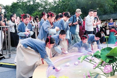 在成都金沙遗址博物馆中,观众“穿越”至一千年前的中秋佳节。依托馆内正在举办的“青·韵——文物里的中国传统色彩美学”特展,现场特别复原了宋代中秋雅集的雅致盛景。现场游客通过簪花、净手、品茗、焚香、听琴、诵诗、制香等环节,在一器一物、一茶一香中感受宋代文人的生活美学。