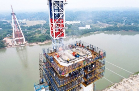 蜀道集团供图◀天眉乐高速虎渡溪岷江特大桥主塔封顶施工现场。