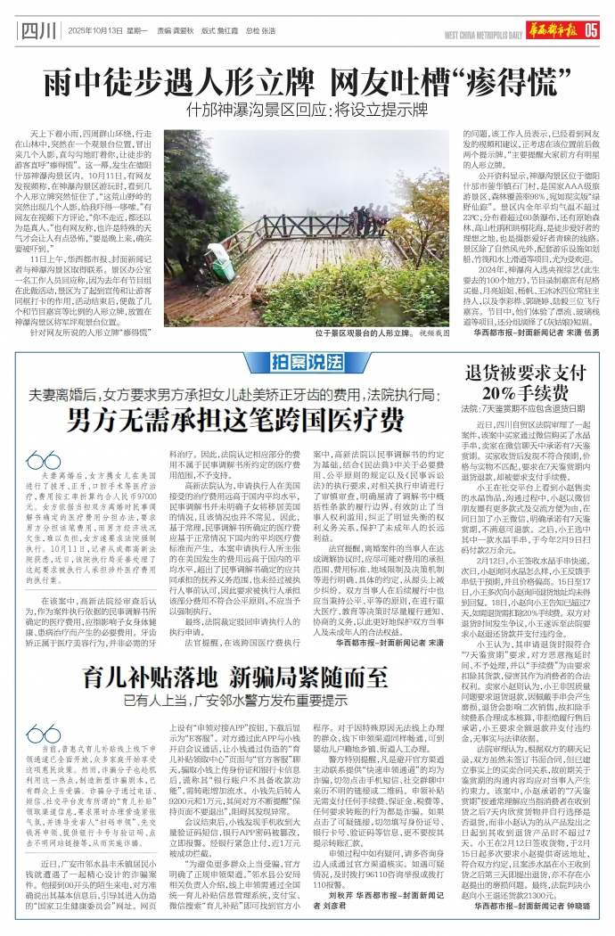 天上下着小雨,四周群山环绕,行走在山林中,突然在一个观景台位置,冒出来几个人影,直勾勾地盯着你,让徒步的游客直呼“瘆得慌”。这一幕,发生在德阳什邡神瀑沟景区内。10月11日,有网友发视频称,在神瀑沟景区游玩时,看到几个人形立牌突然怔住了,“这荒山野岭的突然出现几个人影,给我吓得一哆嗦。”有网友在视频下方评论,“你不走近,都还以为是真人。”也有网友称,也许是特殊的天气才会让人有点恐怖,“要是晚上来,确实要被吓到。”