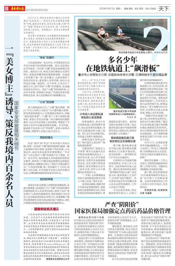 近日,一段“多名少年在重庆地铁轨道上滑行”的视频在社交平台上传播,引发公众对地铁运营安全的关注。