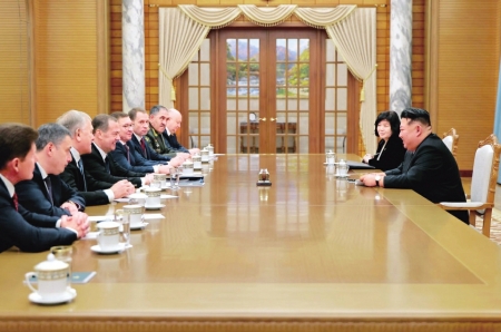 10月10日,朝鲜劳动党总书记、国务委员长金正恩(右一)在平壤会见统一俄罗斯党主席梅德韦杰夫(左四)。 图据新华社客户端