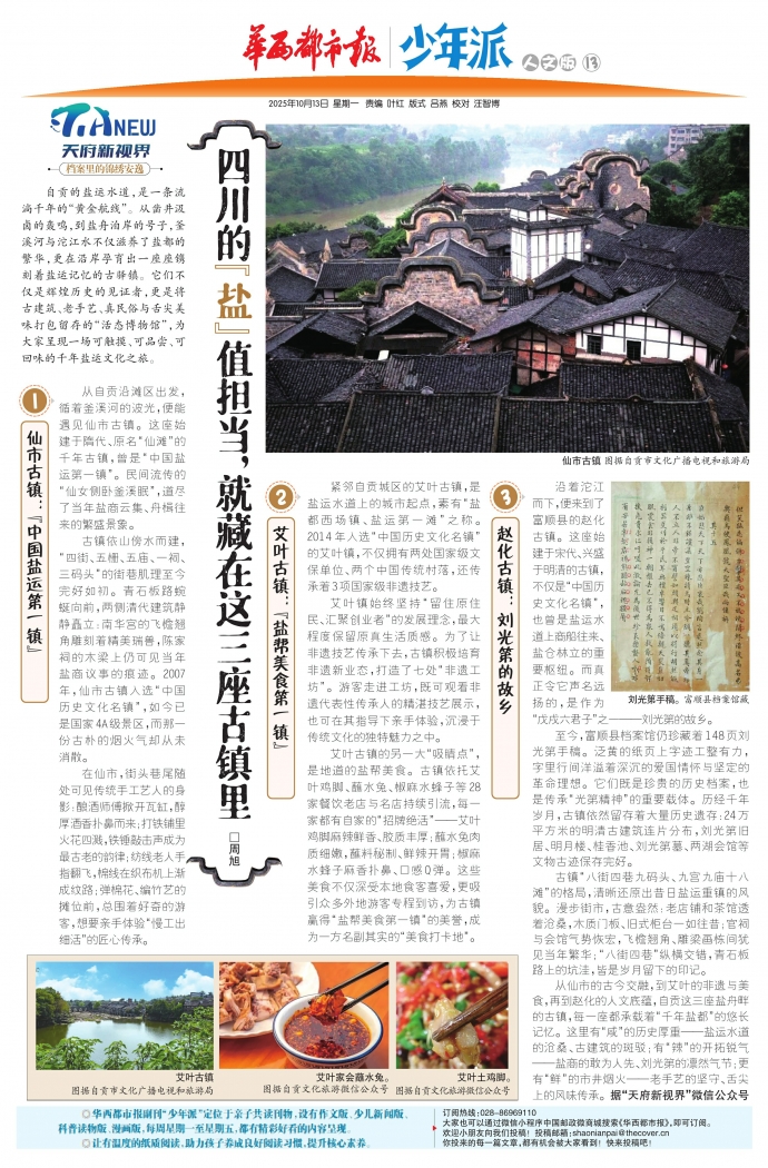从仙市的古今交融,到艾叶的非遗与美食,再到赵化的人文底蕴,自贡这三座盐舟畔的古镇,每一座都承载着“千年盐都”的悠长记忆。这里有“咸”的历史厚重——盐运水道的沧桑、古建筑的斑驳;有“辣”的开拓锐气——盐商的敢为人先、刘光第的凛然气节;更有“鲜”的市井烟火——老手艺的坚守、舌尖上的风味传承。