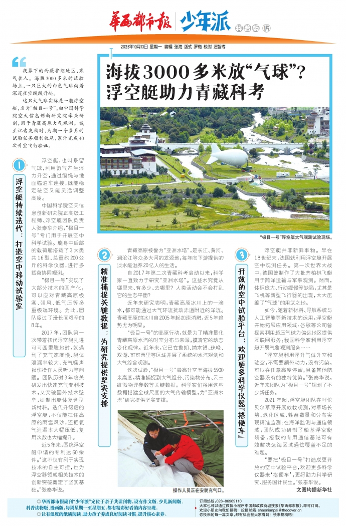 “浮空艇利用浮升气体升空和驻空,不需要额外动力,没有污染,可以在任意高度停留,具备其他航空器没有的独特优势。”张泰华说,近年来团队为“极目一号”规划了不少新任务。