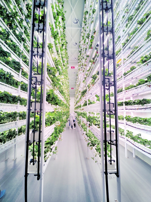 蓝紫色的灯光下,一排排草莓整齐地“住”在共11层、空间达7米高的“公寓”里,穿着洁净服的工作人员站在垂直升降梯上照料它们——这不是科幻电影场景,而是成都温江一座智慧立体草莓工厂的真实画面。