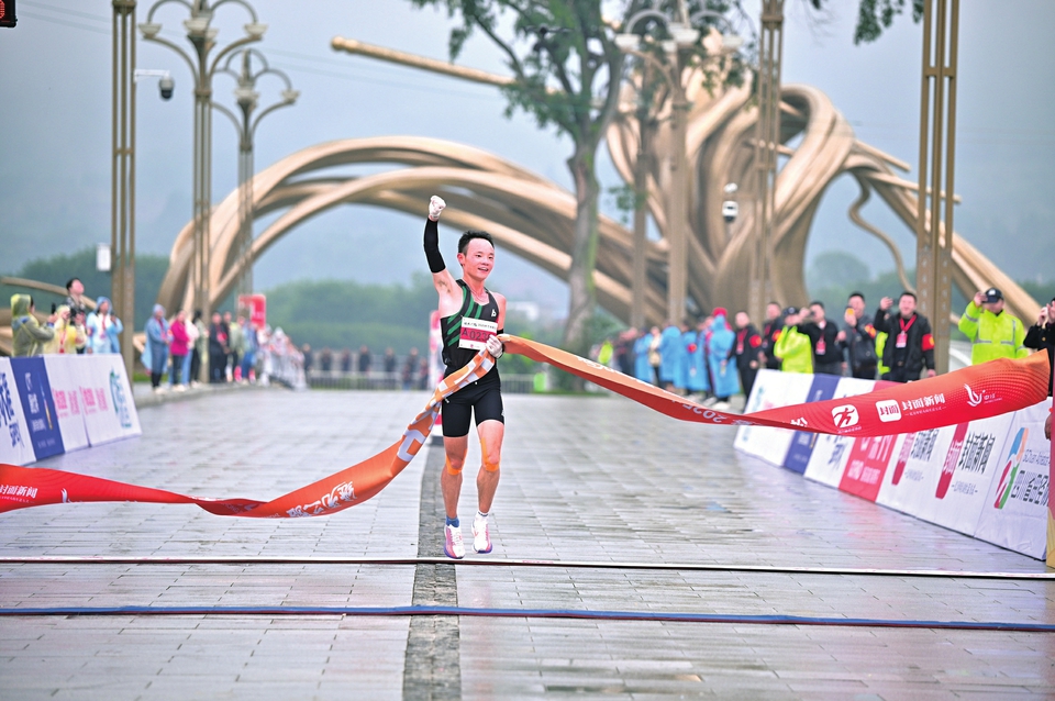 10月26日上午8时,德阳中江,“继光之路”2025中江半程马拉松在秋雨中准时开跑。近3000名跑者自起跑拱门奔涌而出,身影穿梭于城市边缘与凯江江畔。图为中江半马男子组冠军高成易冲线瞬间。 主办方供图