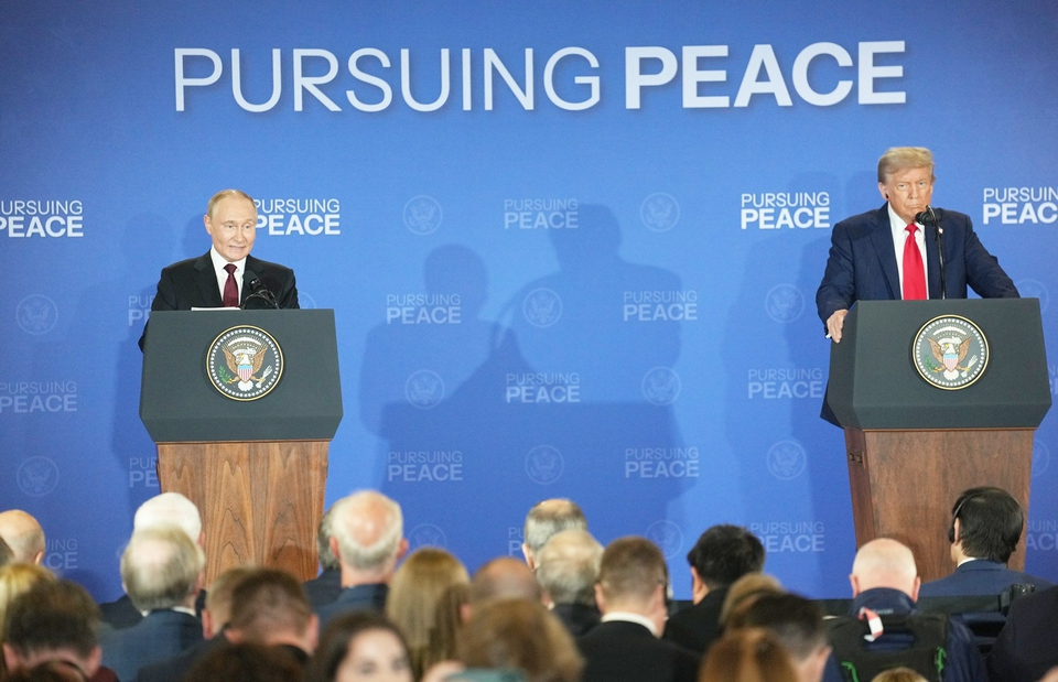 8月15日,美国总统特朗普(右)与俄罗斯总统普京在美国阿拉斯加州安克雷奇市埃尔门多夫-理查森联合军事基地举行会晤后共同出席联合记者会。 新华社发
