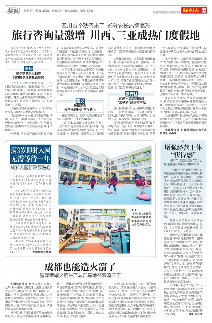 四川首个秋假落地,怎么玩?去哪儿玩?不少家长已经开始规划了。11月5日,华西都市报、封面新闻记者走访了成都部分学校、旅行社,发现旅游市场咨询量明显增加,川西、三亚等地成为热门首选。