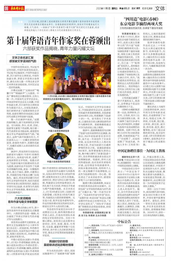 华西都市报讯(记者周琴)11月5日,第38届东京电影节颁奖仪式举行,此前入围主竞赛单元的“四川造”电影《春树》摘得两项大奖:导演张律拿下最佳导演奖,领衔主演王传君获得最佳男演员奖。王传君在发表获奖感言时表示,自己是一个“配得感”很低的人,喜欢躲在团队的角落,成为焦点让他感到恐惧和压力。他感谢了导演张律以及主演白百何、刘丹,“我知道我还差得很远,没想到这么大的奖会落在我的身上。我觉得是白百何女士和刘丹女士她们高光的表现,照亮了在角落的我。”