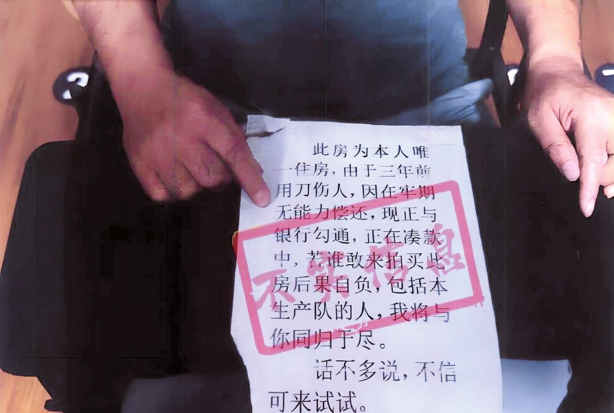 于是,拍卖公告发布不久,当时的房主李先生发现门上被贴上恐吓纸条:“此房为本人唯一住房。三年前因用刀伤人坐牢,无力还贷。谁敢买此房后果自负,我将与你同归于尽,话不多说,不信可来试试!”落款为“原房主”。