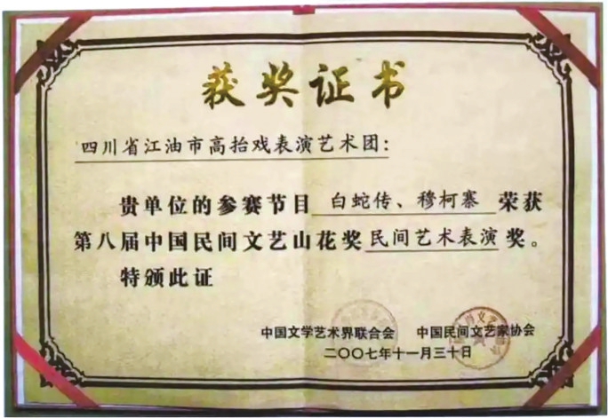 江油市档案馆里,一张珍藏的证书引人注目——2007年,江油市高抬戏表演艺术团参赛节目《白蛇传》《穆柯寨》荣获第八届中国民间文艺山花奖·民间艺术表演奖。