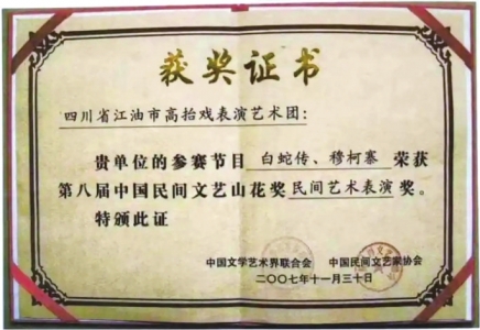 2007年,江油市高抬戏表演艺术团参赛节目《白蛇传》《穆柯寨》获得第八届中国民间文艺山花奖·民间艺术表演奖。 图据江油市档案馆