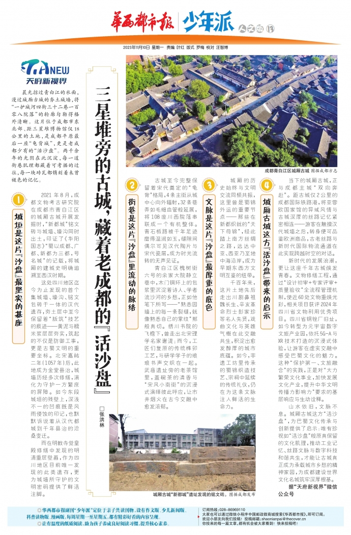 山水依旧,文脉不息。城厢古城这方“活沙盘”,为巴蜀文化传承与创新提供了启示:唯有珍视如“活沙盘”般原真保留的文化肌理,推动工业记忆、丝路文脉与数字科技和谐共生,才能让古城真正成为承载城市乡愁的精神家园,为成都建设世界文化名城筑牢深厚根基。