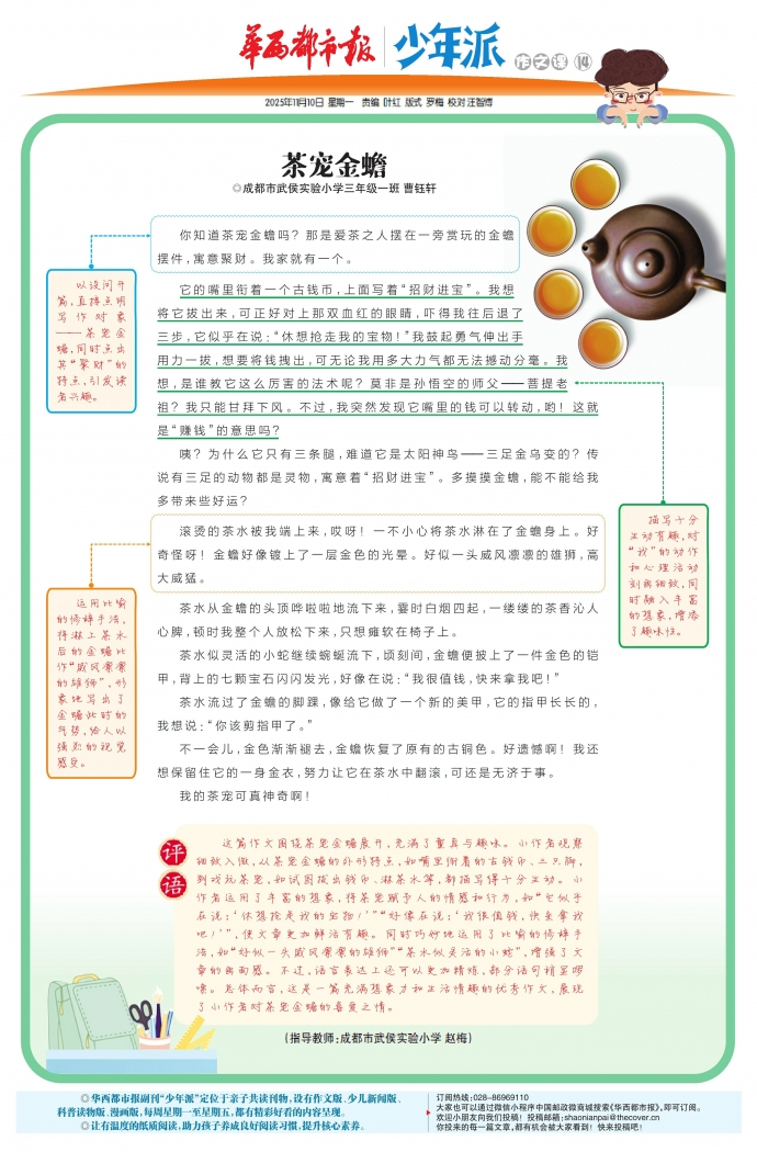 这篇作文围绕茶宠金蟾展开,充满了童真与趣味。小作者观察细致入微,从茶宠金蟾的外形特点,如嘴里衔着的古钱币、三只脚,到戏玩茶宠,如试图拔出钱币、淋茶水等,都描写得十分生动。小作者运用了丰富的想象,将茶宠赋予人的情感和行为,如“它似乎在说:‘休想抢走我的宝物!’”“好像在说:‘我很值钱,快来拿我吧!’”,使文章更加鲜活有趣。同时巧妙地运用了比喻的修辞手法,如“好似一头威风凛凛的雄狮”“茶水似灵活的小蛇”,增强了文章的画面感。不过,语言表达上还可以更加精炼,部分语句稍显啰嗦。总体而言,这是一篇充满想象力和生活情趣的优秀作文,展现了小作者对茶宠金蟾的喜爱之情。