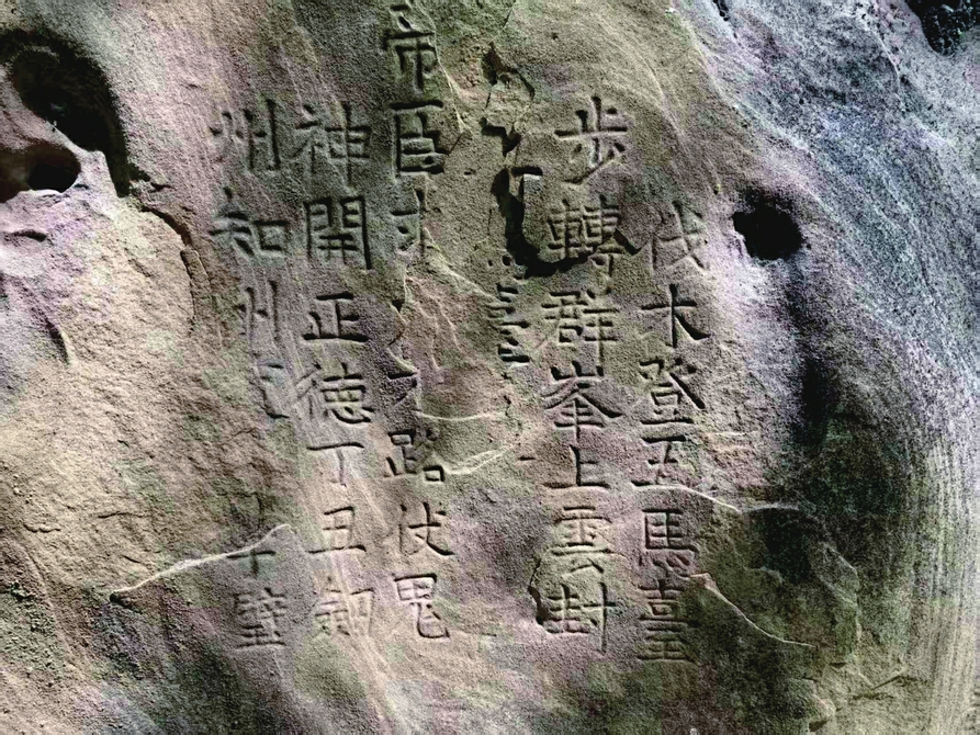 石壁上字迹为:伐木登五马台步转群峰上云封五马台帝臣求□□路伏鬼神开正德丁丑剑州知州武缘李璧细看题刻上的内容,仍能大致分辨出其上的文字。据傅玉斌介绍,这是明正德十二年(1517年),时任剑州知州李璧书题的五言绝句,刻幅高80厘米,宽60厘米。其中,第二行“五马台”3字风化剥蚀严重,但从残存风化笔画依然可辨读。该诗第四行转句,“帝臣求□□”最后两字无法辨读,这块大石南侧还有二处楷书阴刻“五马台”“茶园沟在南三里”依稀可辨。
