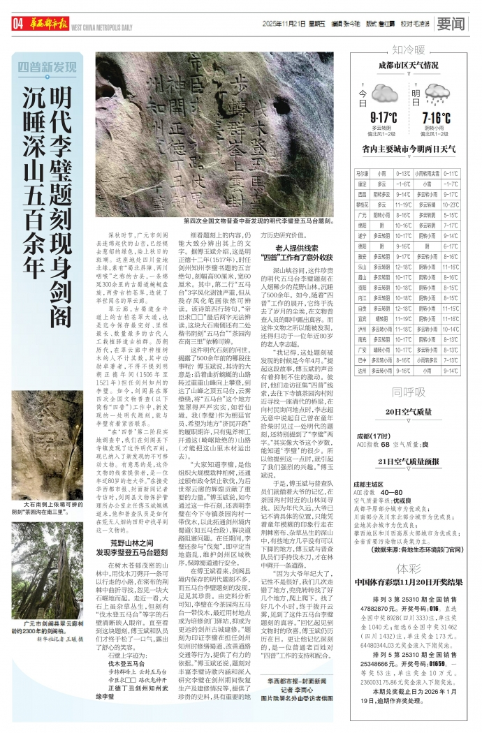 在傅玉斌看来,剑阁县境内保存的明代题刻不多,而五马台李璧题刻的发现,足见其珍贵。由史料分析可知,李璧在今茶园沟五马台一带伐木,最近用材地点或为培修剑门驿站,抑或为更远的剑州古城建修。“题刻为印证李璧在担任剑州知州时修缮蜀道、改善道路交通等行为,提供了有力的依据。”傅玉斌还说,题刻对丰富李璧诗歌内涵和深入研究李璧在剑州期间恢复生产及建修情况等,提供了珍贵的史料,具有重要的地方历史研究价值。