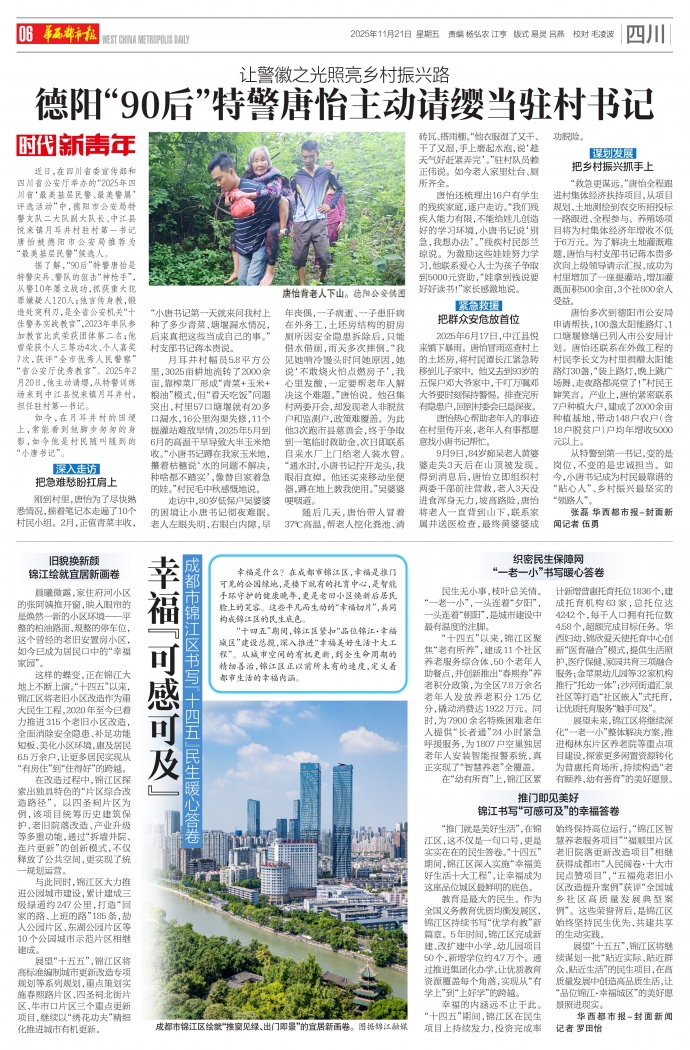 幸福的内涵远不止于此。“十四五”期间,锦江区在民生项目上持续发力,投资完成率始终保持高位运行。“锦江区智慧养老服务项目”“福顺里片区老旧院落更新改造项目”相继获得成都市“人民阅卷·十大市民点赞项目”,“五福苑老旧小区改造提升案例”获评“全国城乡社区高质量发展典型案例”。这些荣誉背后,是锦江区始终坚持民生优先、共建共享的生动实践。