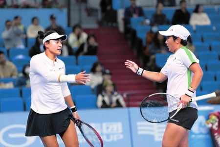 11月19日,第十五届全运会网球项目女子双打决赛,四川队组合王雅繁(左)/蒋欣玗在比赛中。新华社发