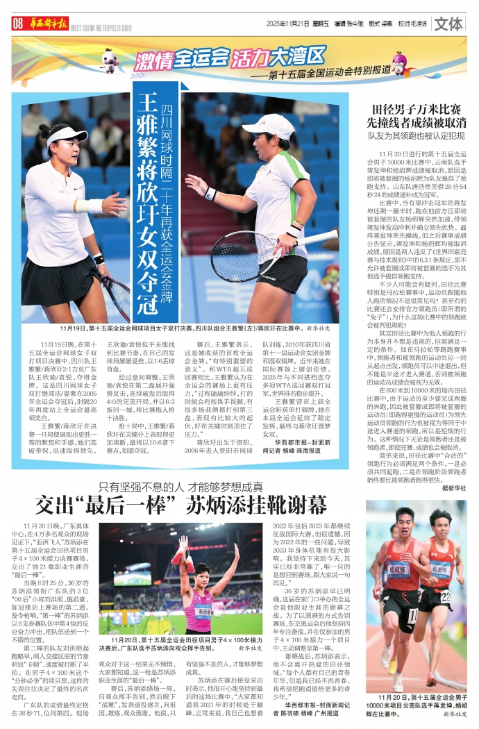 11月20日进行的第十五届全运会男子10000米比赛中,云南队选手蒋发坤和杨绍辉成绩被取消,原因是即将被套圈的杨绍辉为队友提供了领跑支持。山东队唐浩然凭借28分54秒24的成绩递补成为冠军。