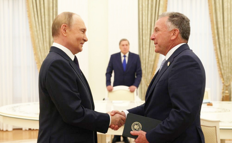 8月6日,在俄罗斯首都莫斯科,俄总统普京(左)在克里姆林宫会见美国中东问题特使威特科夫。 图据新华社客户端