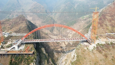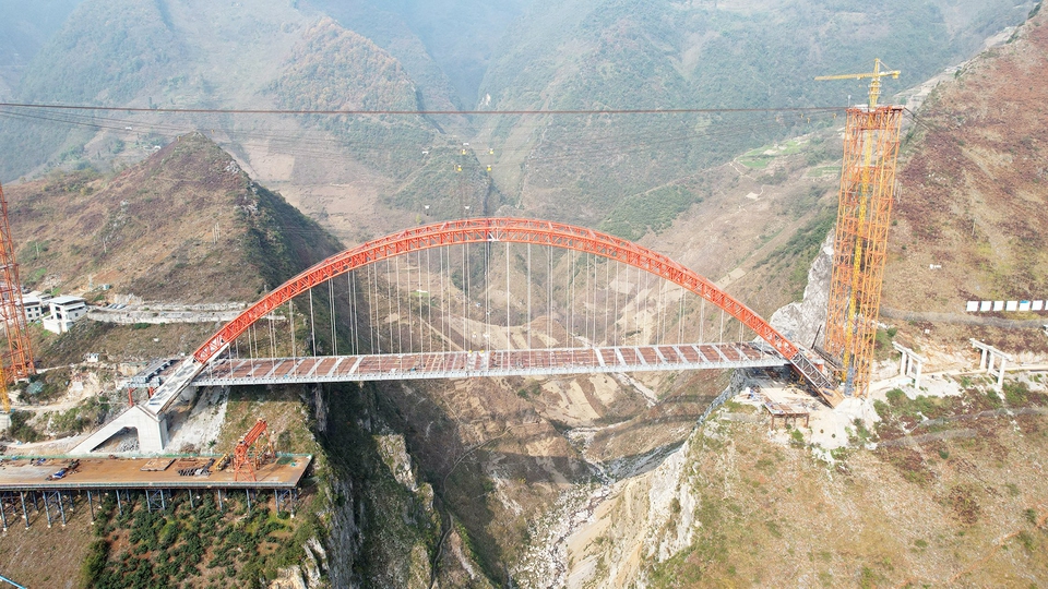 面对复杂地形地质,建设团队以两项核心技术突破实现了高效建造:一是国内首创的非对称高低主拱设计,二是全装配化施工工艺的全面应用。前者完美适应了峡谷两岸不平顺的地形,在保障结构稳固的前提下,减少了拱座开挖量和混凝土工程量;后者实现了构件从工厂化预制到现场精细化加工、模块化组装的全程精准控制,从源头上解决了“巨构积木”的生产与高效组装问题。这两大技术的协同应用,显著提升了大桥对复杂环境的适应性,大幅节约了资源投入,增强了结构整体稳定性,为大桥的合龙提供了有力支撑。
