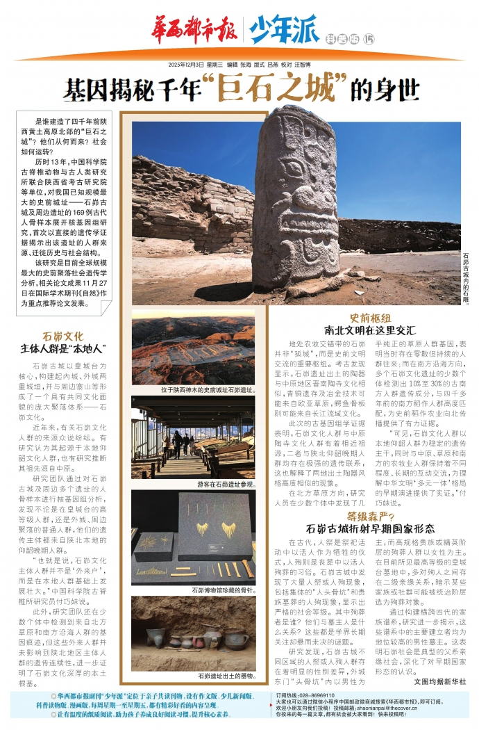 历时13年,中国科学院古脊椎动物与古人类研究所联合陕西省考古研究院等单位,对我国已知规模最大的史前城址——石峁古城及周边遗址的169例古代人骨样本展开核基因组研究,首次以直接的遗传学证据揭示出该遗址的人群来源、迁徙历史与社会结构。