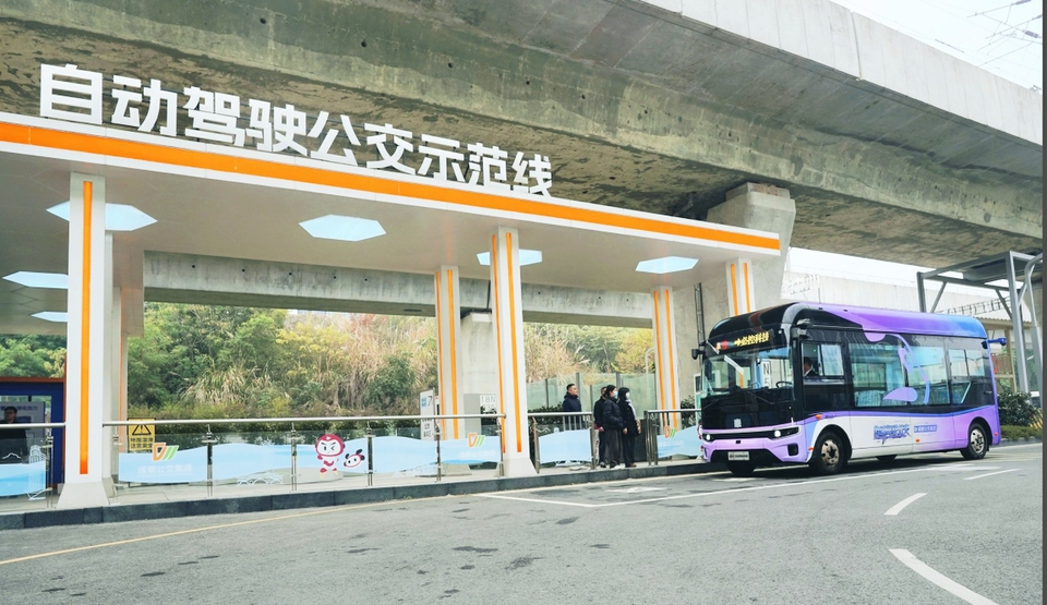 成都自动驾驶公交示范线载客运行。图据成都公交集团