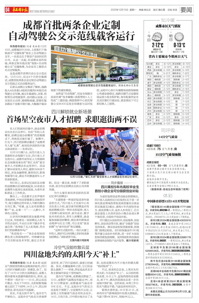 华西都市报讯(记者 吴冰清)12月12日,成都福田TOD站,上班族们下地铁就可“无缝衔接”地坐上自动驾驶公交车,一站直达位于智创产业园B区的公司。从这一天起,在成都未来科技城,两条定制专线实现“地铁+自动驾驶公交”无缝换乘,为企业员工提供点对点定制服务。