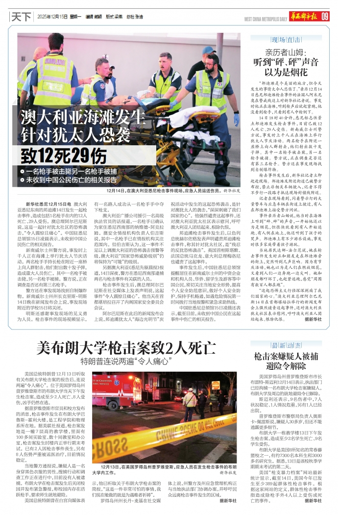 另据澳大利亚《悉尼先驱晨报》报道,14日深夜,警方在悉尼西南部逮捕两名与枪击事件有关联的人员。