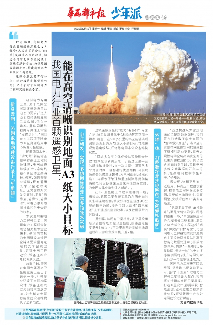 12月10日,我国电力行业首颗遥感卫星电力工程号(又名吉星高分07D01星)成功进入预定轨道,标志着国家电网在关键技术领域实现新突破,为保障国家能源安全、构建新型电力系统注入新动能。