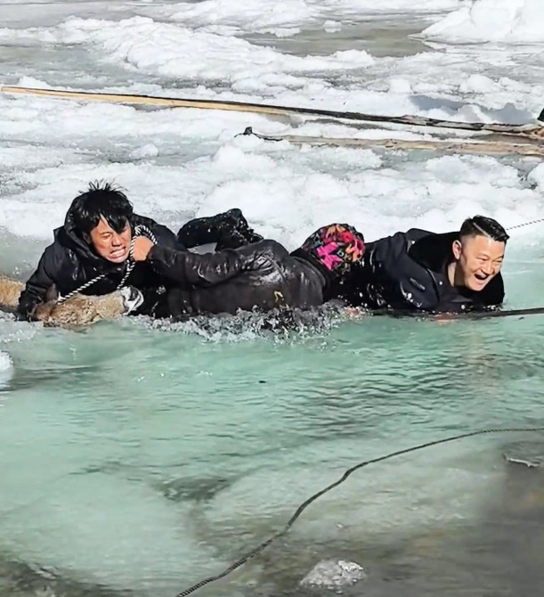 “一开始我们用绳索套在白唇鹿身上,想把它们拉出来。但发现一是冰面较薄,不好受力;二是白唇鹿的体重比较大,拉不上来。”危急时刻,辅警降拥扎西带头,和两名当地村民一起,陆续跳入冰冷刺骨的河中。靠近白唇鹿所在位置后,他们利用救援绳索将被困白唇鹿精准套牢,岸边的警民再齐心牵引。