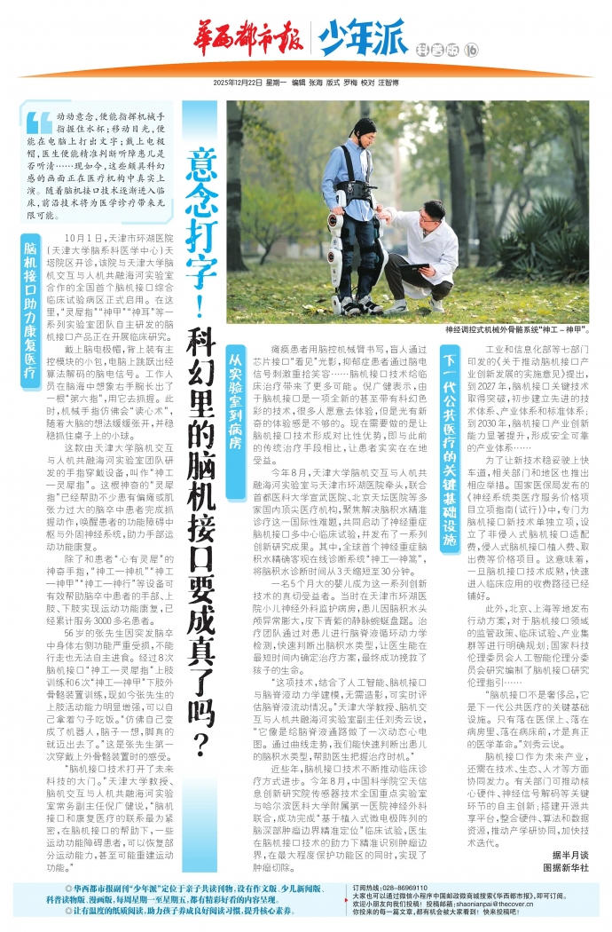 脑机接口作为未来产业,还需在技术、生态、人才等方面协同发力。有关部门可推动核心硬件、神经信号解码等关键环节的自主创新;搭建开源共享平台,整合硬件、算法和数据资源,推动产学研协同,加快技术迭代。