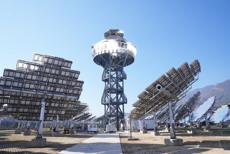 进入基地大门,首先映入眼帘的,是一座加氢站,其外表和加油站没有太大区别。右边,144个多边形定日镜,环绕在一座“水塔”模样的聚光反应塔下,把不远处三个绿色的储气罐衬托得有些“娇小”。