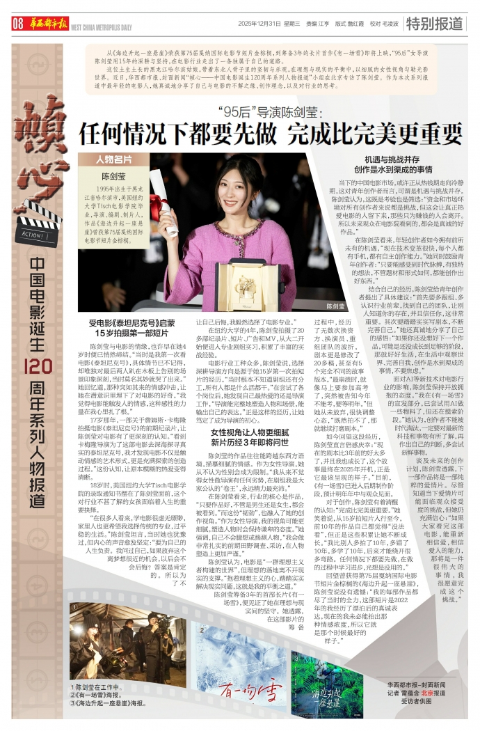 从《海边升起一座悬崖》荣获第75届戛纳国际电影节短片金棕榈,到筹备3年的长片首作《有一场雪》即将上映,“95后”女导演陈剑莹用15年的深耕与坚持,在电影行业走出了一条独属于自己的道路。