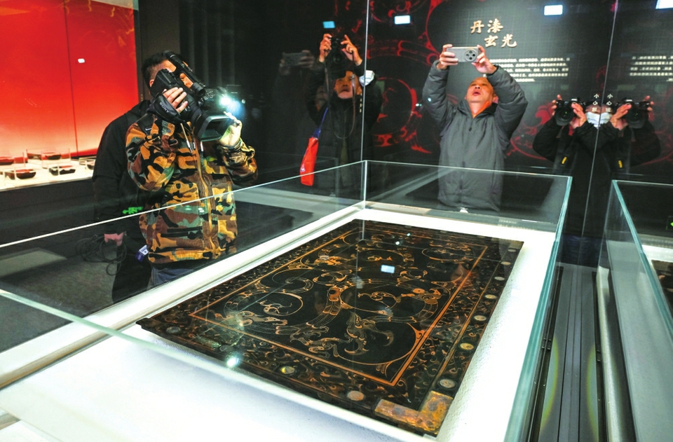 彩绘龙凤纹漆木案。新华社发