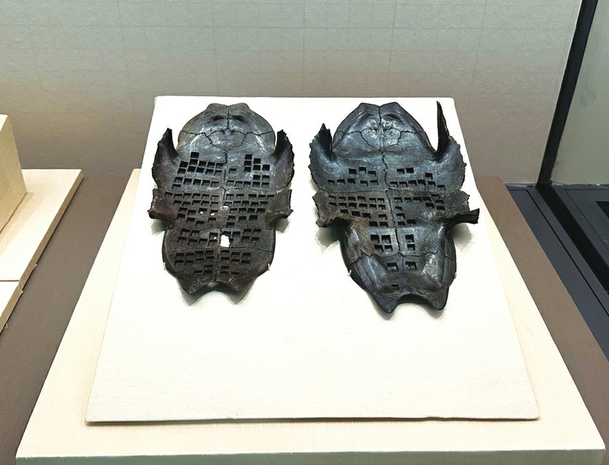 此次展出中还有多件特殊的“黑甲”,它们通体黝黑,形制罕见,是楚王珍藏——“长霝(líng)”。这些甲骨的出土地点是武王墩一号墓南边的椁室,根据椁室上的墨书文字,南边为“楚王府库”,也就是楚王的珍藏。
