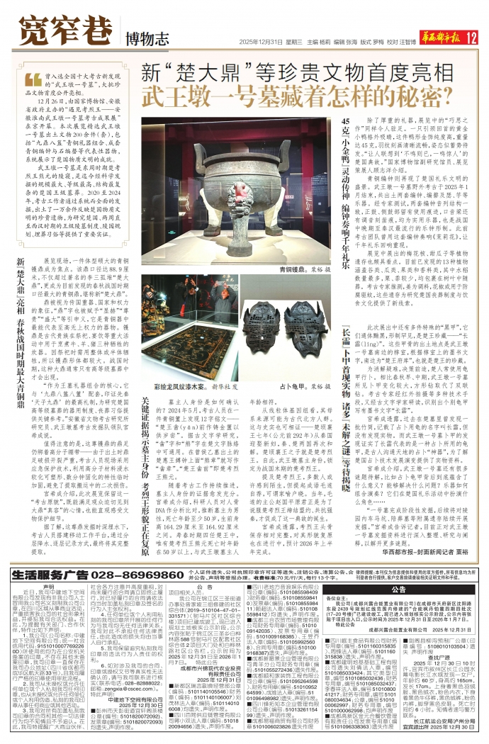 12月26日,由国家博物馆、安徽省政府主办的“遇见考烈王——安徽淮南武王墩一号墓考古成果展”在京开幕。本次展览精选武王墩一号墓出土文物200余件(套),包括“九鼎八簋”青铜礼器组合、成套青铜编钟与石编磬等代表性器物,系统展示了楚国物质文明的成就。