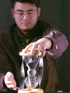 传统器物如紫砂壶、印章等方案先后被否,“因为那样就看不出来月壤本身的样子了”。最终,沙漏的构想被确定下来——沙漏是中国古代就有的计时器,而复刻月壤制成的沙用以计时正好合适。刘玉将沙漏设计为5分钟流尽。