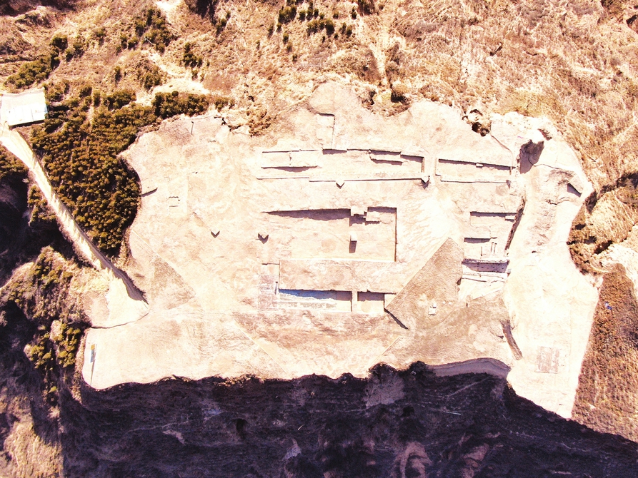 陕西清涧寨沟遗址寨塬盖夯土建筑群俯瞰。