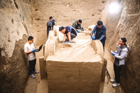 陕西省考古研究院寨沟遗址考古队在陕西清涧瓦窑沟墓地M4号墓葬清理马车。