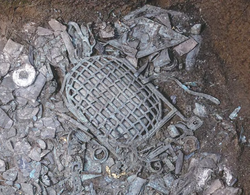 四川大学考古文博学院教授黎海超在解读三星堆青铜器铸造工艺时,特别提示在主流的陶范铸造青铜器的工艺之外,三星堆的锻打技术尤为值得关注。三星堆祭祀坑出土的锻打类铜器数量极多,类别丰富,包括铜叶、铜鱼、铜带等,也表现出更高的工艺水准。例如在一件龟背形网格状器上,以两条青铜条带交叉穿过网格镂空,呈“背带”状将整个器物“捆绑”。这两条青铜条带韧性较好,就是通过锻打制作而成。