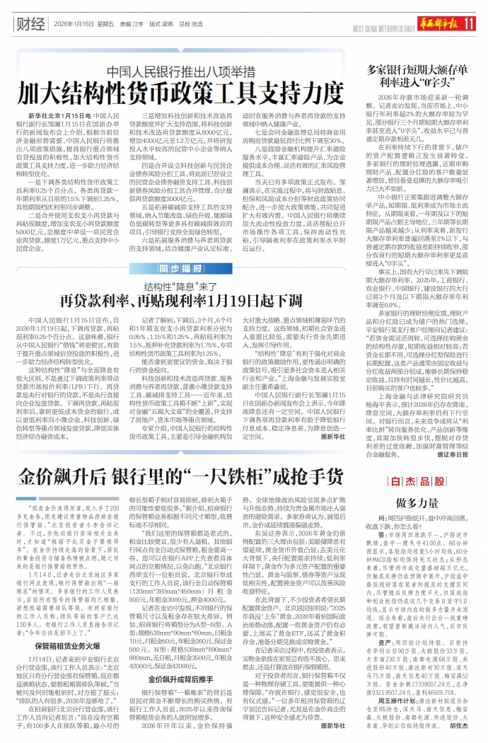 新华社北京1月15日电 中国人民银行副行长邹澜1月15日在国新办举行的新闻发布会上介绍,根据当前经济金融形势需要,中国人民银行将推出八项政策措施,提高银行重点领域信贷投放的积极性,加大结构性货币政策工具支持力度,进一步助力经济结构转型优化。