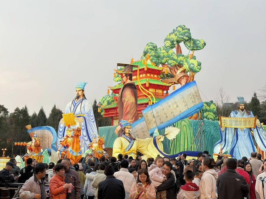 据介绍,本届庙会灯组规模创下历年之最,灯组总量涵盖16组大型灯组、13组中小型灯组、19处氛围灯组,搭配约1.3万个氛围灯,勾勒出一幅“灯映三国福满蓉城”的新春画卷。