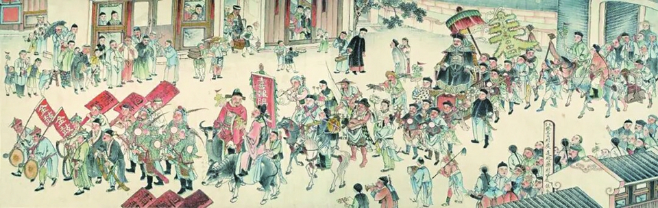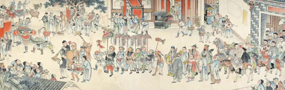 此外,画卷中还隐藏着更多生动年俗细节——游春队伍里,流行于川北的七节断尾龙灯在足盆鼓、包包锣等伴奏下欢腾起舞;纸扎彩灯“水八仙”栩栩如生;沿街商铺门贴春联、门神;街角小贩手摇拨浪鼓,孩童举着风车嬉戏追逐;身着棉袍的妇人手提贺年礼盒走亲访友……这些细碎而鲜活的情景,共同拼合出清代绵竹迎春盛会的完整画卷,让百年后的观者仍能感受当时街市的欢腾气息。