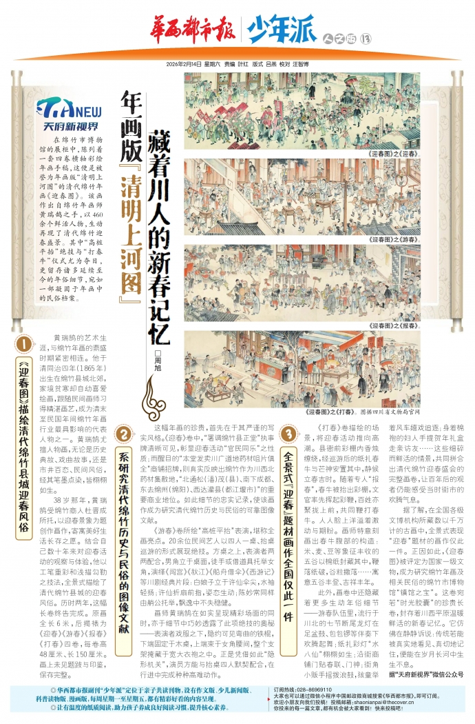 据了解,在全国各级文博机构所藏数以千万计的古画中,全景式表现“迎春”题材的画作仅此一件。正因如此,《迎春图》被评定为国家一级文物,成为研究绵竹年画及相关民俗的绵竹市博物馆“镇馆之宝”。这卷宛若“时光胶囊”的珍贵长卷,封存着川西平原温暖鲜活的新春记忆。它仿佛在静静诉说:传统若能被真实地看见、真切地记住,便能在岁月长河中生生不息。